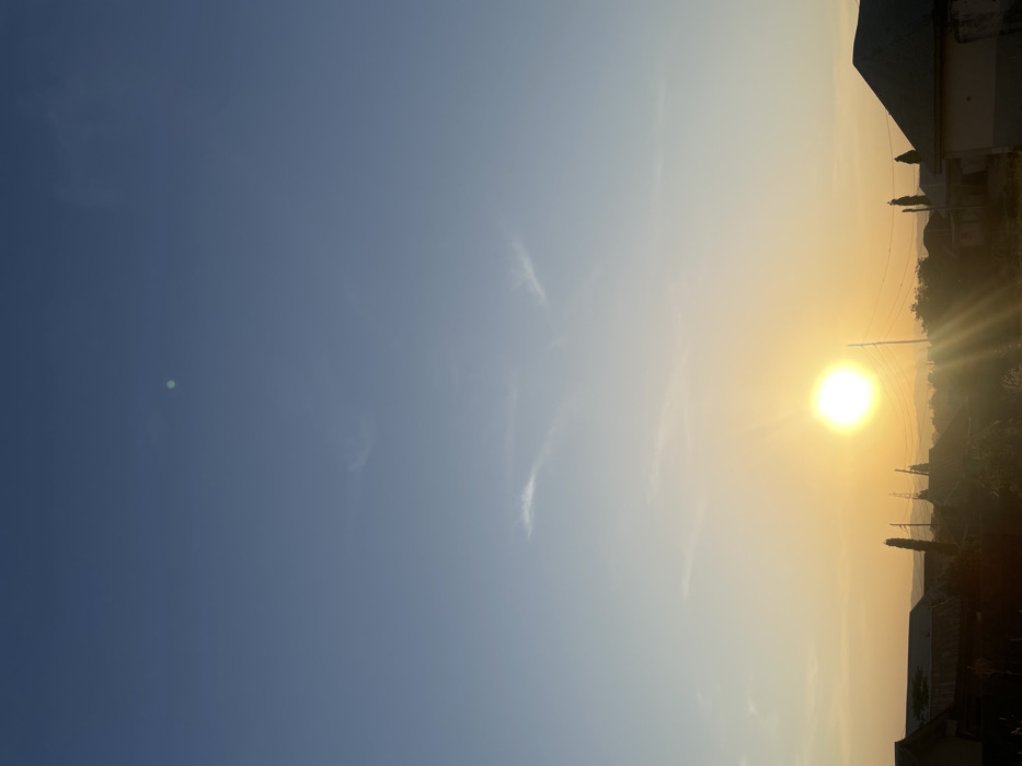 A sunrise illuminates the right side of the image with a bright, round sun shining through a hazy sky. Trees and buildings are silhouetted against the sun. To the left, the sky transitions to a deep blue, almost devoid of clouds. A small, pale dot, possibly a celestial object, is visible in the lower left quadrant. The sky appears to be largely clear, transitioning from a pale yellow at the horizon to a vibrant blue overhead.