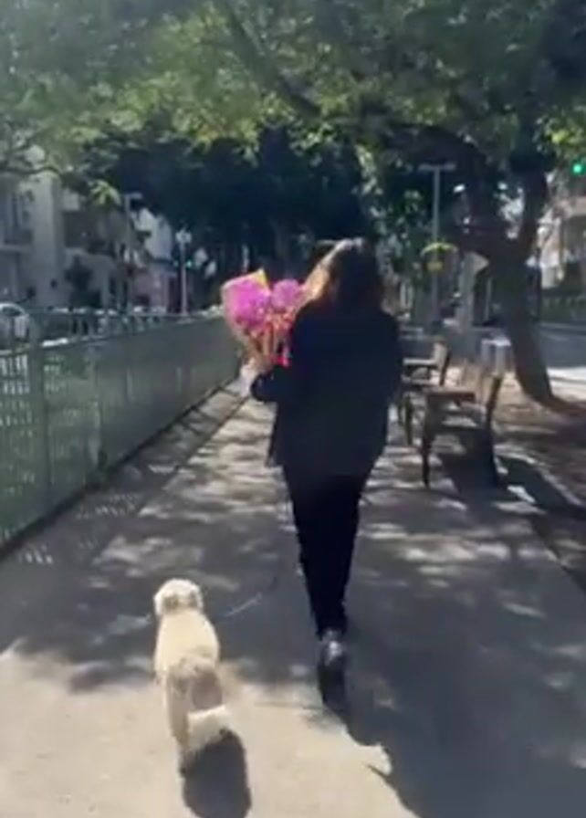 A person walks on a sunny sidewalk with a small white dog on a leash. The person carries a bouquet of pink and yellow flowers. They are walking away from the camera, next to a low metal fence and under trees. On the other side of the fence is a street with a bus and some cars. Benches and tables are visible near the trees.