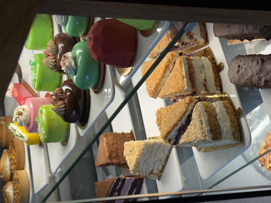 - "This image captures a multi-tiered display case filled with an assortment of desserts inside a bakery or patisserie in Hrodna, Belarus" by FM-yjK1X2, licensed under CC BY 4.0