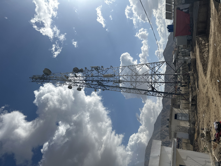 An overhead photograph, taken under a partly cloudy sky with bright sunlight, depicts a telecommunications tower and surrounding structures in Kuchlak, Pakistan