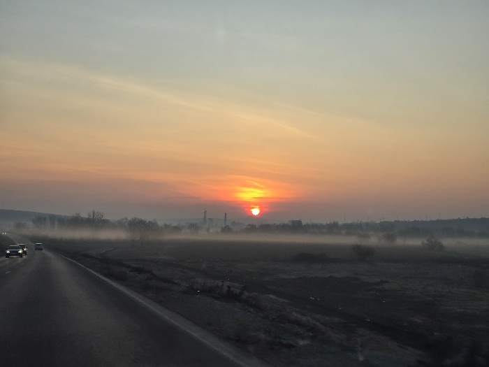The image presents an outdoor scene in Opanets, Bulgaria, captured during either sunrise or sunset. A two-lane asphalt road extends from the lower-left foreground into the distant center. Two vehicles, appearing to be passenger cars, are visible on the road in the mid-left, traveling away from the camera, with their headlights illuminated. To the right of the road, a large field or expanse of land is covered by a thick layer of ground fog or mist. Leafless trees and shrubs are sparsely distributed, with their upper branches visible above the mist. The sun, a distinct red and yellow orb, is positioned low on the horizon, slightly to the right of the image center, partially obscured by atmospheric haze. In the background, several tall industrial chimneys or smokestacks are discernible above the mist, indicating an industrial facility. The sky transitions from a vibrant orange and red near the horizon, directly above the sun, to softer yellow and pale blue tones towards the top of the frame. No human individuals or explicit interactions are depicted. The overall environment suggests cool, possibly damp, atmospheric conditions.