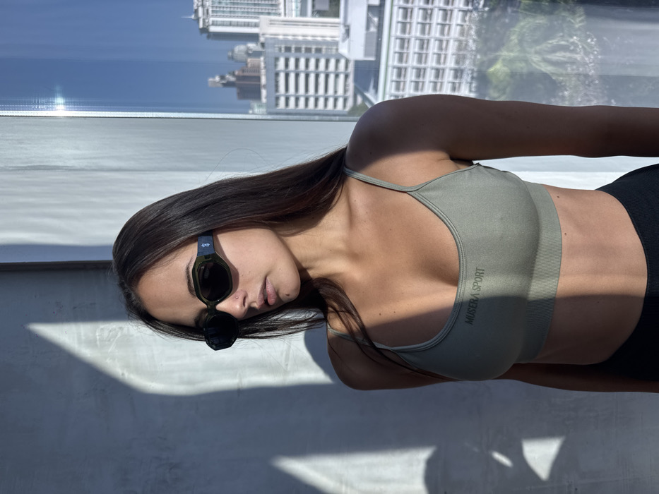 A female subject stands indoors, illuminated by natural light, facing slightly left. She wears dark, hexagonal-framed sunglasses with blue-patterned temples and a light olive green 'MUSERA SPORT' branded spaghetti strap sports bra over dark bottoms. Her long, dark hair is visible, and she has a nose piercing on her left nostril. To her right, a large window reveals a sprawling cityscape of Bangkok, Thailand, comprising numerous high-rise buildings under a clear blue sky. Distinct, angular shadows are cast onto the light-colored wall behind her on the left.