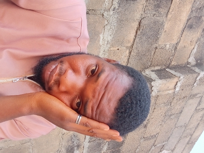 A man rests his head on his hand. The man has dark skin, short, dark hair, and a short beard. He wears a light pink shirt with a zipper. He has a ring on his finger. Behind the man is a brick wall made of light beige bricks. The image is slightly tilted. The man gazes into the camera.