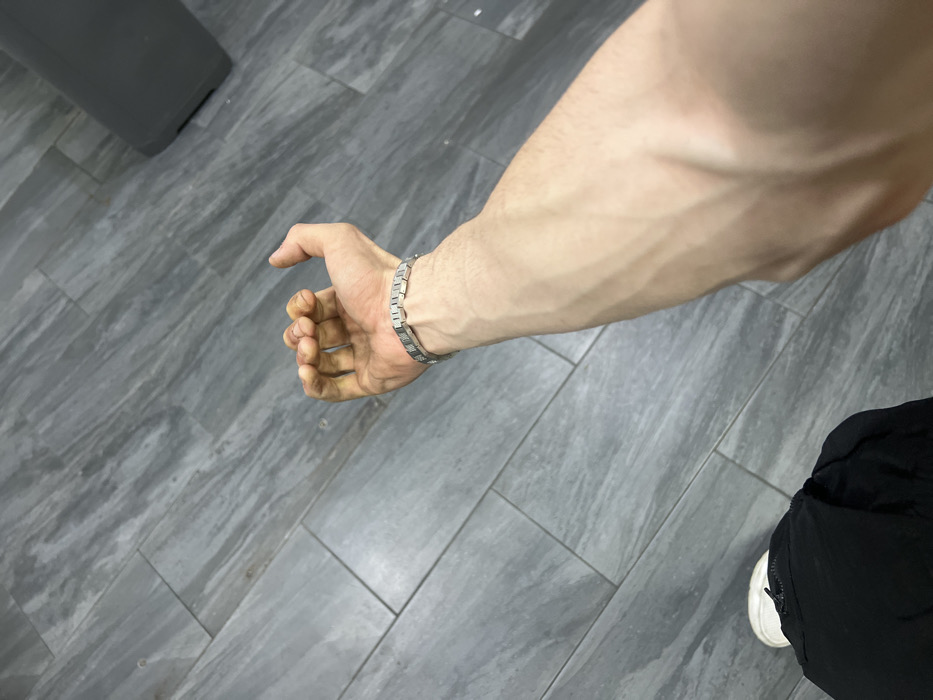 The scene depicts an interior setting within the City of Unknown, Unknown. The floor is composed of rectangular grey tiles with a subtle streaked or marbled pattern, laid in a staggered configuration. In the upper right quadrant, a dark grey, rectilinear object, possibly a piece of furniture or container, rests on the tiled surface. The primary subject is the individual's right arm and hand, viewed from a downward, first-person perspective. The arm exhibits prominent vascularity, particularly along the forearm. A silver-colored metal link bracelet or watch band is worn on the right wrist. The hand is partially clenched, with fingers curled inwards. The skin on the knuckles and back of the hand displays a brownish discoloration. The lower portion of the individual's left leg is visible in the bottom-left corner of the frame, clad in black fabric trousers and a white athletic shoe. The individual is standing with the arm extended and wrist bent.
