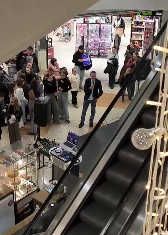 man with a microphone speaking to a small crowd of people in what appears to be a shopping mall. He is standing near a DJ setup with a laptop and mixing board. An escalator is visible on the right side of the frame, decorated with string lights. The crowd of people are standing and listening to the man speak. Behind the crowd, there is a store with shelves of products. The camera is positioned above the scene, looking down at the event.
