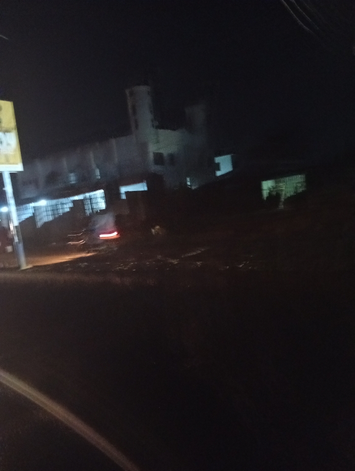 A night scene depicts a large, white building with a tower-like structure. The building is illuminated by several lights and appears to have windows. A sign is visible on the left, partially obscured. A blurry streak of red and white suggests a moving vehicle. The foreground is dominated by darkness, obscuring details of the landscape. The overall impression is of a building viewed from a distance in low light.