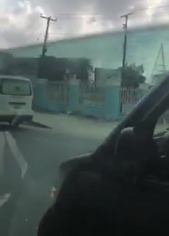 view from inside a moving vehicle, likely a car, as it drives along a street in what appears to be a populated area. The sky is overcast with grey clouds. Outside the car window, there are other vehicles, including a red car and a silver van, moving in the same direction. A building with a light blue fence and white trim is visible, possibly a church, as well as power lines, utility poles, and green trees in the background. The road appears wet, suggesting it might have recently rained.