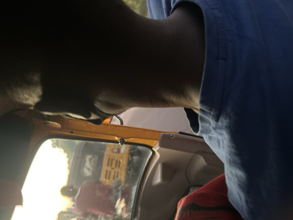 An indoor shot with part of a person's face, head, and upper body angled downwards. The person wears a blue shirt. A yellow vehicle interior frames the scene, with the outside world visible through the window, showing a blurred street scene and part of a yellow vehicle. The light is bright and diffused, creating strong shadows on the person's face and neck.