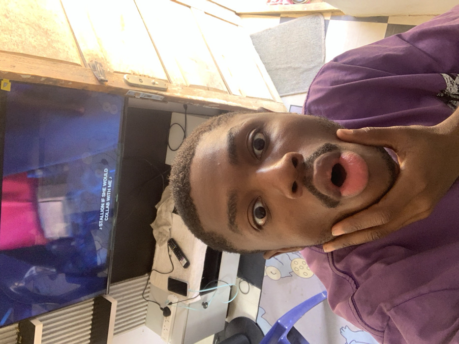 The image depicts a male individual in a domestic or studio setting within Barakin Lerawi, Nigeria, captured in a selfie-style close-up