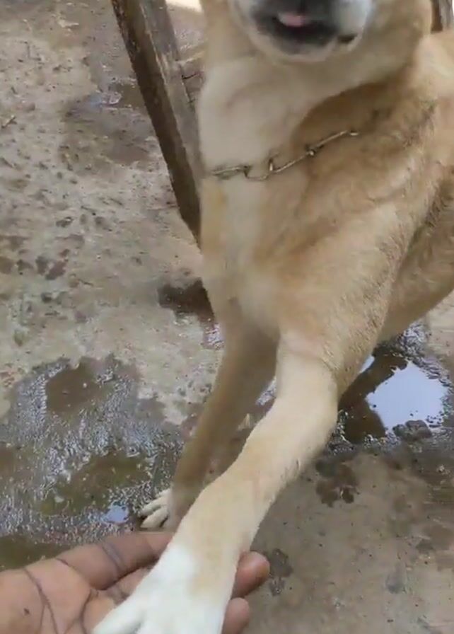 A tan-colored dog with white paws, a white muzzle and chest, and sad, dark eyes is standing on a concrete surface that is wet in places. The dog is on a chain attached to its collar. A person with dark skin and a symbol drawn on their hand is holding out their hand to the dog, who has placed their paw in the person’s hand. The person is making a kissing sound. The dog looks back at the person and then back at their hand. A wooden stool or bench is visible in the background.