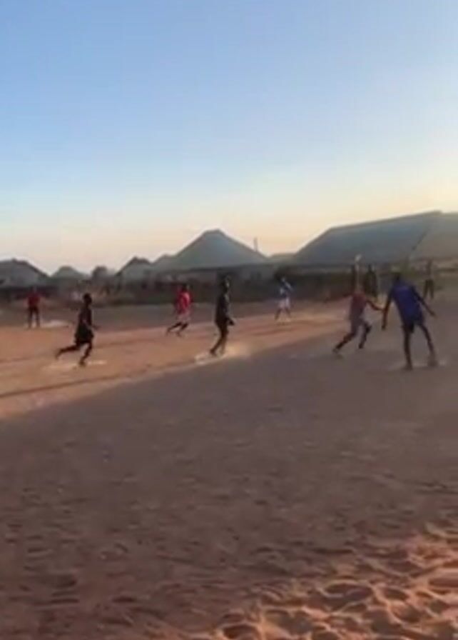 Several young men are playing soccer on a dry, dusty field. They wear a variety of casual clothing, including t-shirts and shorts, in dark and blue colors. The field has a goal at one end. Houses with gray roofs are visible in the background, as well as utility poles and wires. The sky is clear and blue, with sunlight creating long shadows. Dust rises as the players run and kick the ball.
