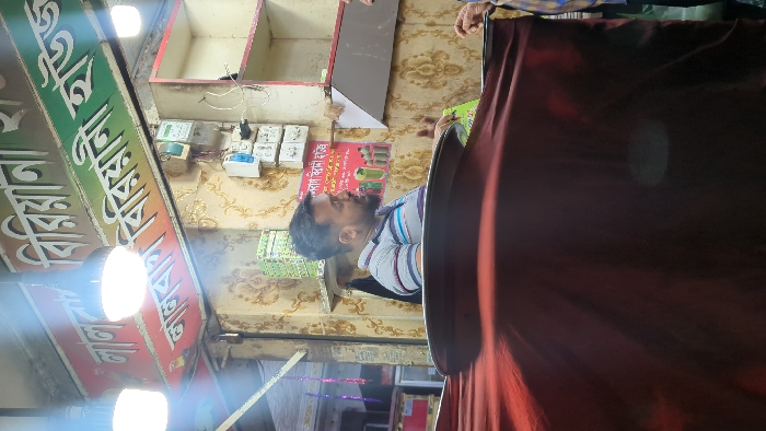 A man stands near a brown curtain. He has a beard and is wearing a striped shirt. Behind him is a shelf with an electrical outlet. To the left, a sign is visible with text in a different language. The background wallpaper has a floral pattern. A light fixture is also visible, providing illumination.