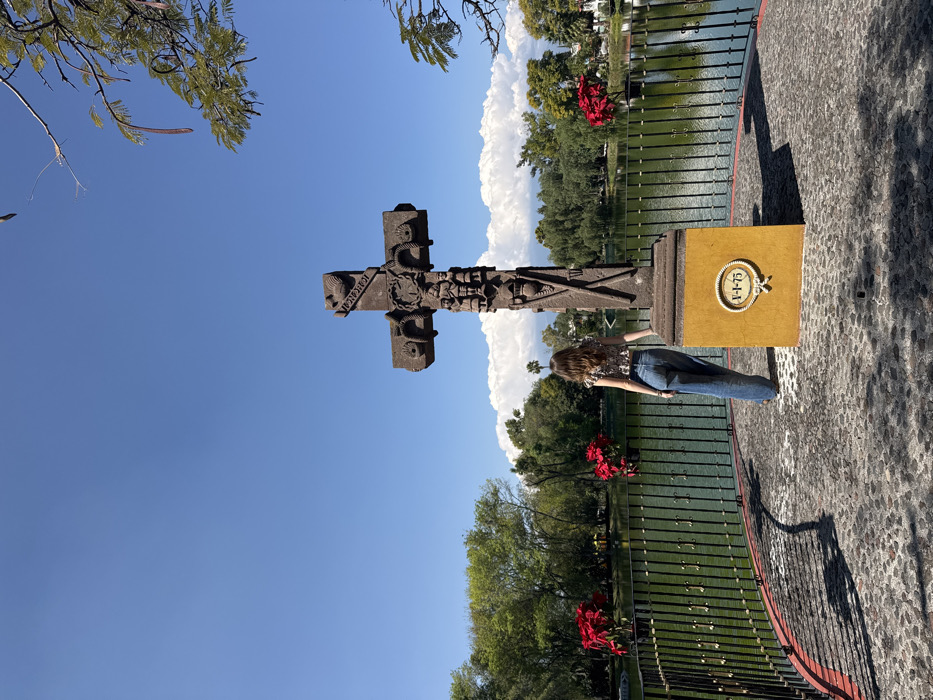 A weathered stone cross stands tall against a clear blue sky and fluffy white clouds. The cross features intricate carvings and a weathered inscription. Beside the cross, a yellow monument displays a circular emblem with a date, V-1-75. A woman with long hair rests her arm on the monument. The backdrop showcases a green pond enclosed by a black wrought-iron fence adorned with red poinsettias, surrounded by lush trees. The scene is captured from a slightly tilted perspective.
