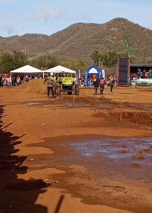 A scene captures a muddy off-road race event. A lime green Jeep is navigating a challenging track with deep ruts filled with muddy water. Three event personnel are near the vehicle, likely providing guidance or assistance. A crowd of spectators is gathered in the background, watching the event unfold. A stage with speakers and banners suggests a formalized event with potential announcements or music. White tents are scattered, potentially for vendors or event support. The landscape includes a backdrop of rolling hills under a clear blue sky with scattered clouds. The scene suggests an outdoor motorsports event.