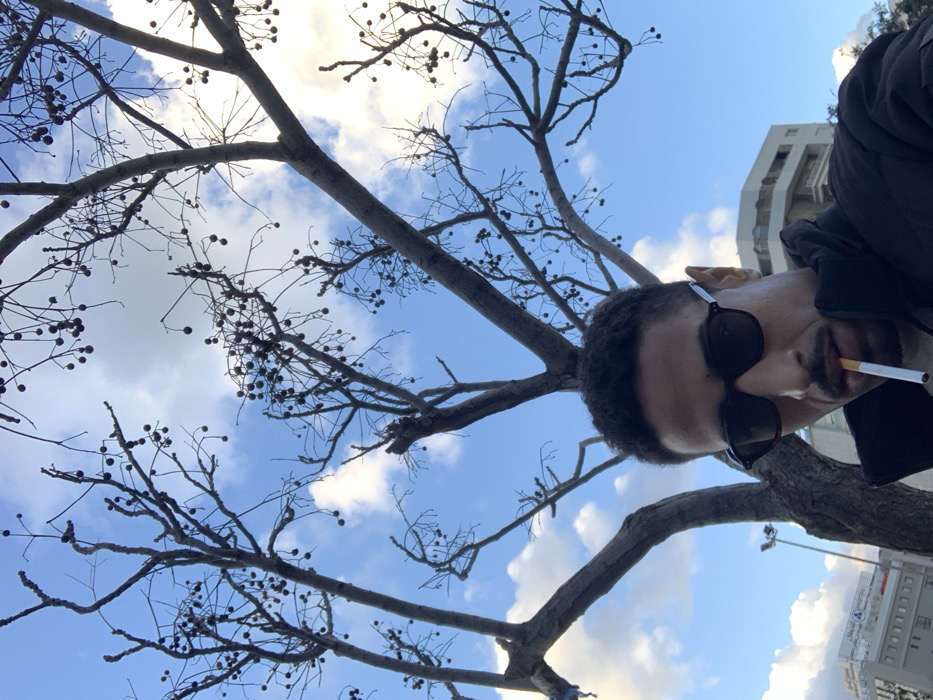 The image depicts an adult male in an urban outdoor setting in Tétouan, Morocco. The subject, positioned centrally, looks directly at the camera. He has dark, short curly hair, a light mustache, and stubble, and is wearing dark sunglasses and a dark puffer-style jacket. An unlit cigarette is held between his lips. The background features the bare branches of a large tree, laden with numerous dark, spherical seed pods, silhouetted against a blue sky with scattered white clouds. To the left, a portion of a light-colored building with visible windows and a partially obscured red logo, identified as "Banque Populaire," is discernible. To the right, a multi-story, light-colored building with distinctive rounded corners is partially visible. A black street light pole is also present behind the subject on the left. The specific location is consistent with central Tétouan, likely along Avenue Mohammed V or near Place Moulay El Mehdi, given the architectural style and visible commercial signage.