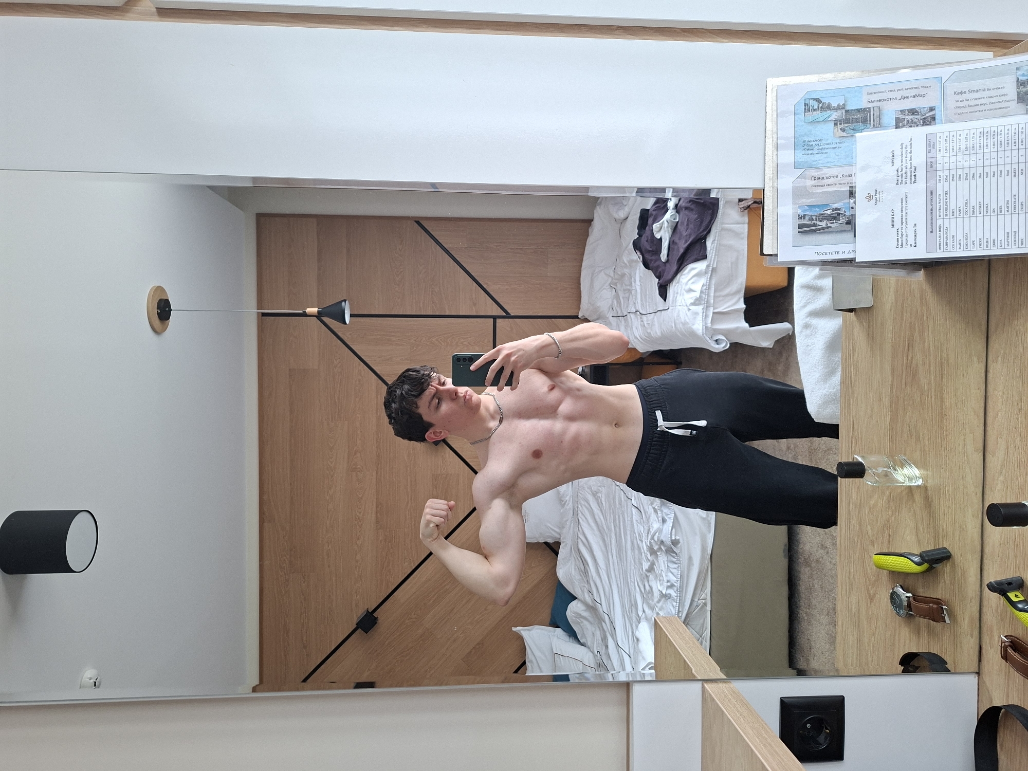 A young adult male is captured in a mirror selfie within a modern hotel room at Hotel Sevtopolis Thermal & Spa in Pavel Banya, Bulgaria. The male, appearing to be in his late teens or early twenties, is shirtless and wearing black sweatpants with a white drawstring. He stands with his left arm flexed, showcasing his bicep, while holding a dark-colored smartphone in his right hand to capture the image. He has short, dark, curly hair and a muscular build, with visible abdominal muscles and some minor redness on his chest. The reflection reveals a room with two unmade beds pushed together, covered in white bedding, against a light wood-paneled headboard featuring a geometric pattern of black strips. A blue pillow is visible on the left bed, and dark clothing items are casually placed on the right bed. Overhead, a black drum-shaped ceiling light and a black pendant light fixture are present. The walls are light-colored, and the floor is a light wood laminate. In the immediate foreground, on a light wood-grain countertop, several objects are visible: a black electrical outlet, a dark wristband, a wristwatch with a brown leather strap, a bright yellow-green utility tool, a clear bottle of cologne, and a black bottle. To the right, an acrylic holder contains hotel documentation, including a prominent "MINI BAR" menu with items and prices listed in both Bulgarian and English.