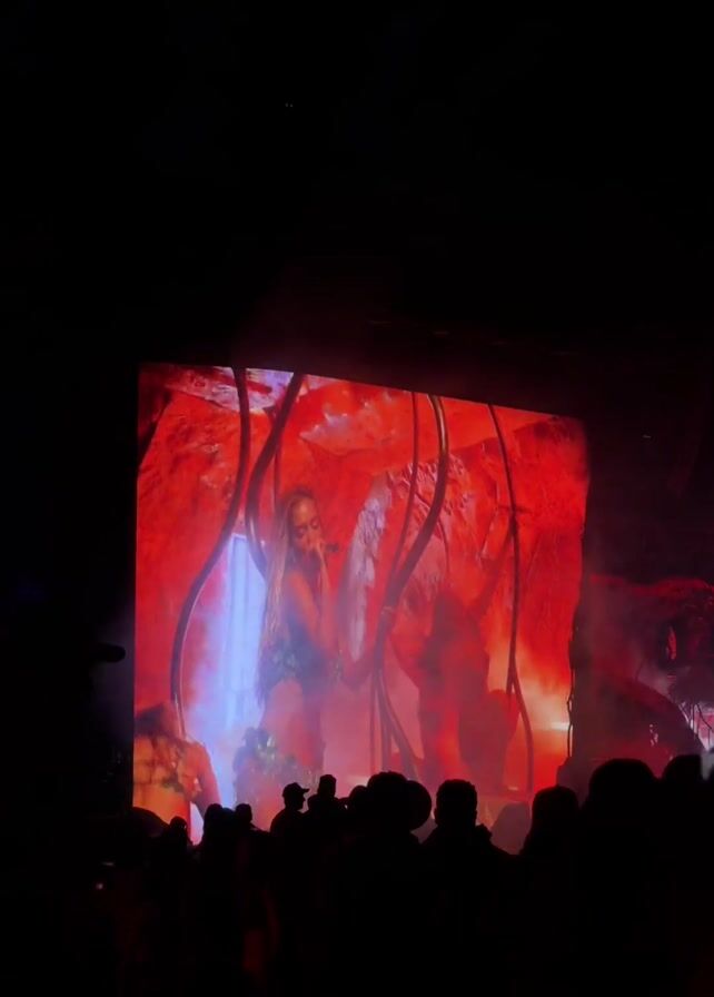 concert scene with a large screen displaying a singer. The singer is a woman with long hair, and she's wearing a sparkly outfit. She is holding a microphone and appears to be performing. The screen behind her is a red and black backdrop that occasionally turns blue. In front of the screen, there's a crowd of people, mostly silhouetted, watching the performance. The scene is dark, with the light coming primarily from the screen.