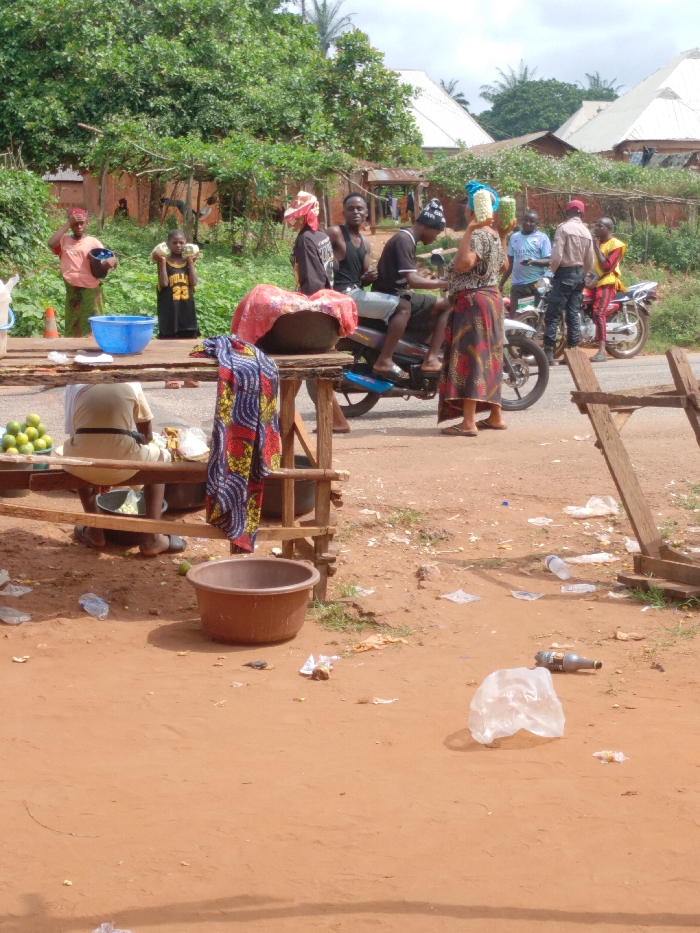 - "The scene depicts an unpaved roadside area in Ejule, Nigeria, under a bright, slightly hazy sky" by FM-TKrYD3, licensed under CC BY 4.0