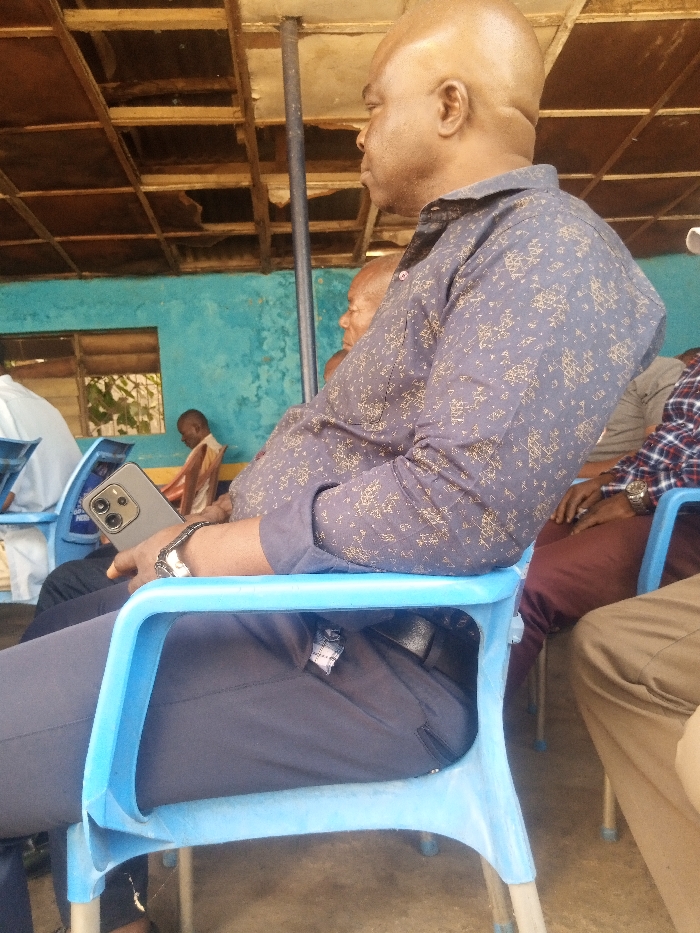 The scene depicts an informal gathering indoors in the city of Sardauna, Nigeria. In the foreground, a bald, dark-skinned male, presumably middle-aged, is seated in profile on a light blue plastic chair, facing right. He wears a dark blue long-sleeved collared shirt with a light-colored geometric pattern and dark trousers. His left hand, adorned with a watch, holds a grey smartphone featuring a prominent triple-lens camera module. Behind him, another dark-skinned male is partially visible, also seated. Further in the background on the left, a third dark-skinned male is seated. The immediate environment includes additional light blue plastic chairs, parts of other individuals (including one wearing a plaid shirt and another in white attire), and a visible dark vertical support pole. The background features a faded light blue/aqua painted wall, discolored in areas, with a barred window revealing green foliage outside. The ceiling consists of an exposed wooden lattice or frame structure, showing signs of wear or incomplete construction. Natural light illuminates the area.