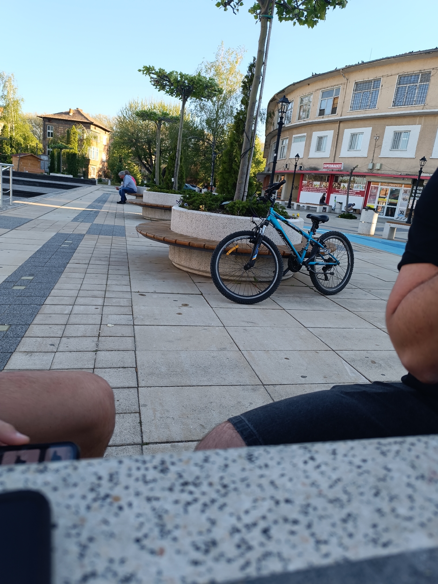 The image depicts a public space in Septemvri, Bulgaria. A blue and black mountain bike is parked near a curved bench made of wood and concrete. In the background, a building with a "Supermarket" sign is visible. A person is sitting on a bench in the distance, and the edge of another building is seen on the left. In the foreground, the knees and legs of two people are visible, as well as a mobile phone. The area is paved with light-colored tiles with darker gray inserts. Trees are planted around the benches.