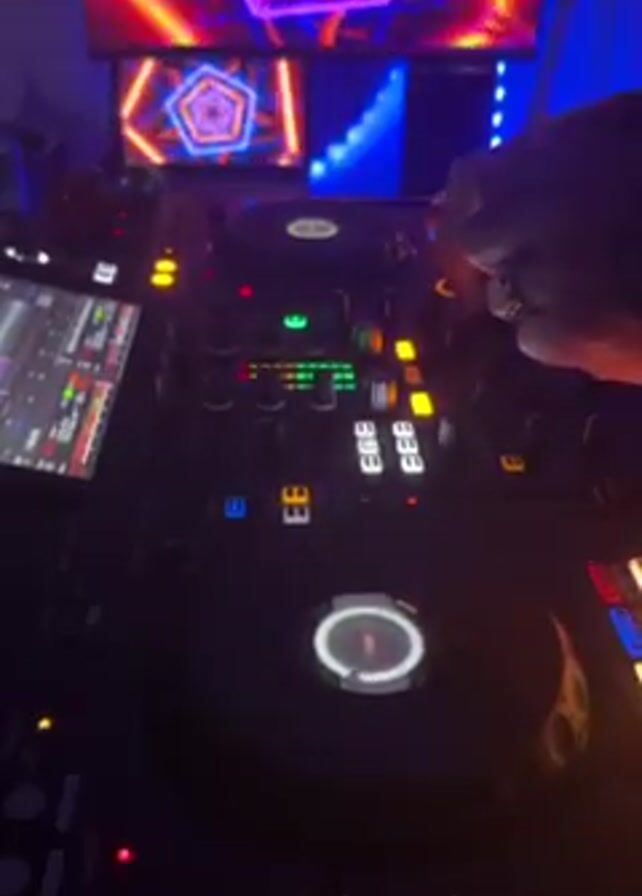 DJ using a professional mixing console. The console is black with many illuminated buttons, knobs, and sliders, including an illuminated display screen. The DJ is adjusting the controls with their hands, focusing on the equipment. Behind the DJ, there are two screens displaying colorful, pulsating geometric patterns. The room is dimly lit with colored lights, creating a nightclub or party atmosphere. The video is shot at a close angle, showing the equipment and DJ's hands in detail.