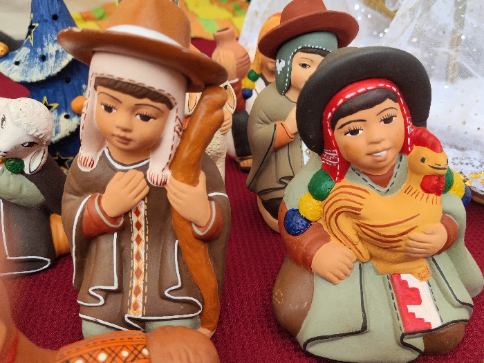 Two hand-painted figurines stand prominently on a red surface. The figurine on the left, a male, wears a brown hat and carries a brown staff. His clothing is detailed with orange and white stitching. The right figurine, a female, has a black hat with a red trim, holds a yellow rooster, and wears a green and white patterned garment adorned with colorful pompoms. Other figurines and holiday decorations are visible in the background, creating a festive scene.