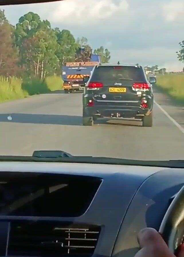 A driver is operating a car on a paved road. Ahead, a dark Jeep Grand Cherokee with license plate "ADE 4272" is driving. Further ahead, a large blue truck carrying heavy equipment is also driving. The sky is bright, suggesting daylight. Green trees line the roadside. The interior of the filming vehicle is visible, including the dashboard and the driver's hand on the steering wheel.