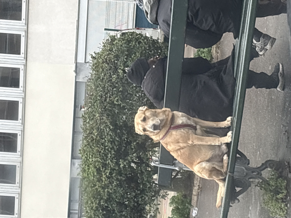 - "A medium-to-large-sized, light-tan dog wearing a red harness sits upright on a dark green public park bench" by FM-yD2SV2, licensed under CC BY 4.0
