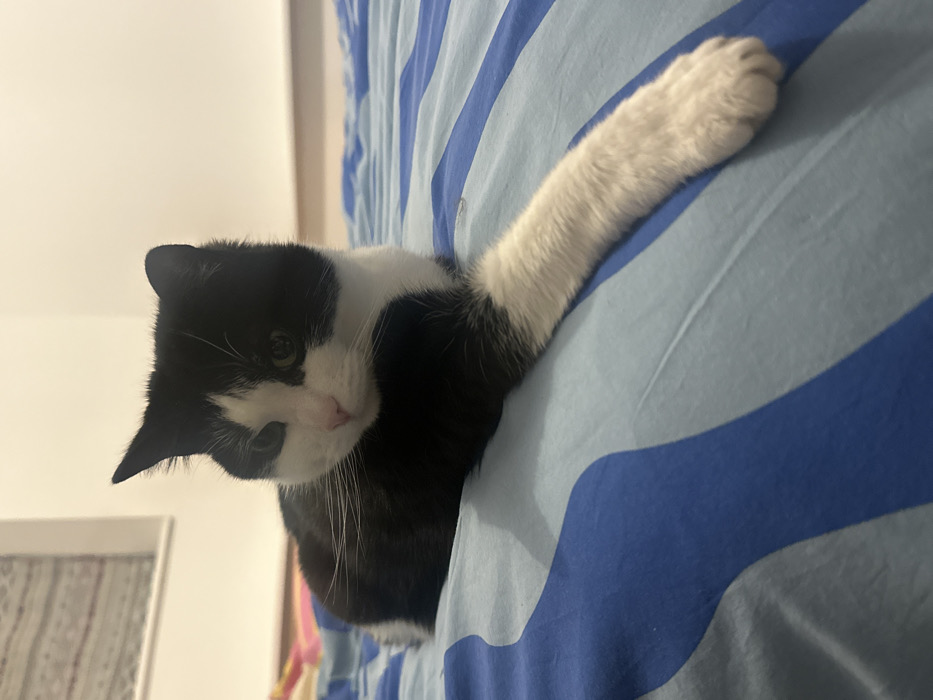 - "A black and white cat lies on a blue and white striped bedspread" by FM-sKHBD2, licensed under CC BY 4.0