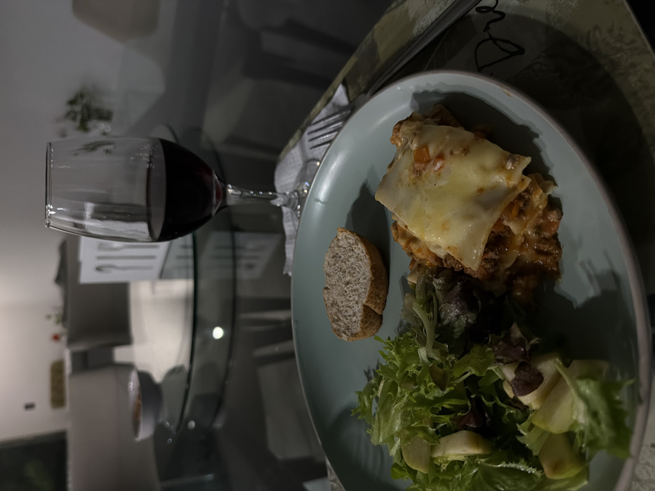 - "A plate of lasagna sits alongside a slice of bread and mixed green salad with sliced apples" by FM-LC3mB2, licensed under CC BY 4.0