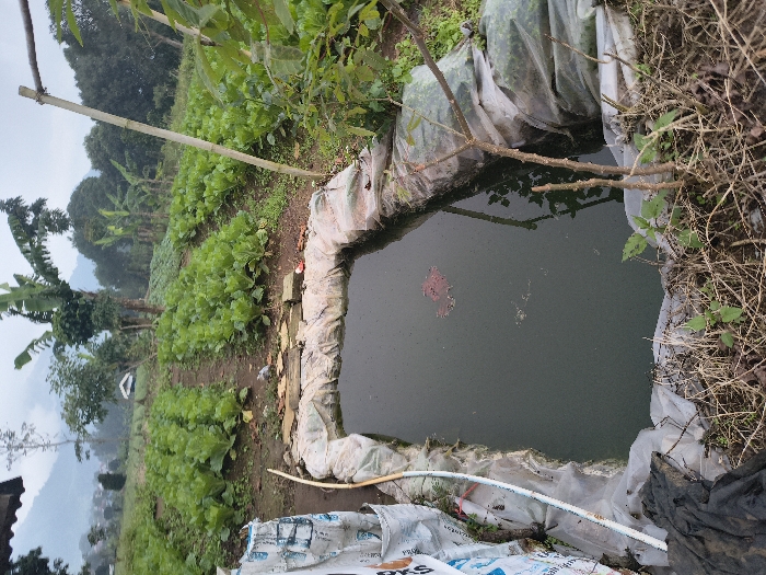 An agricultural scene shows a rectangular pond lined with plastic sheeting, filled with dark water and floating debris. Surrounding the pond is dense vegetation, including cultivated rows of leafy green plants and scattered trees. Bags with visible writing are stacked near the pond. The landscape includes distant hills obscured by mist. A bamboo structure stretches over the garden.