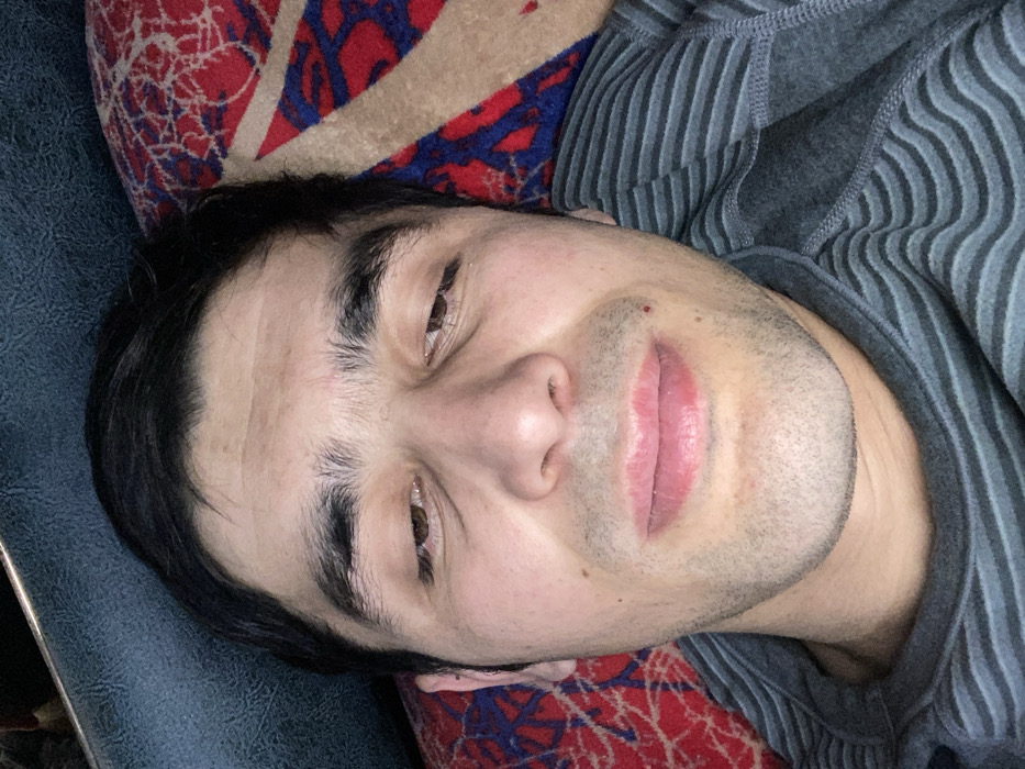 - "A fair-skinned man with dark hair and eyebrows lies on a patterned surface, possibly a cushion or blanket" by FM-fKVxi2, licensed under CC BY 4.0