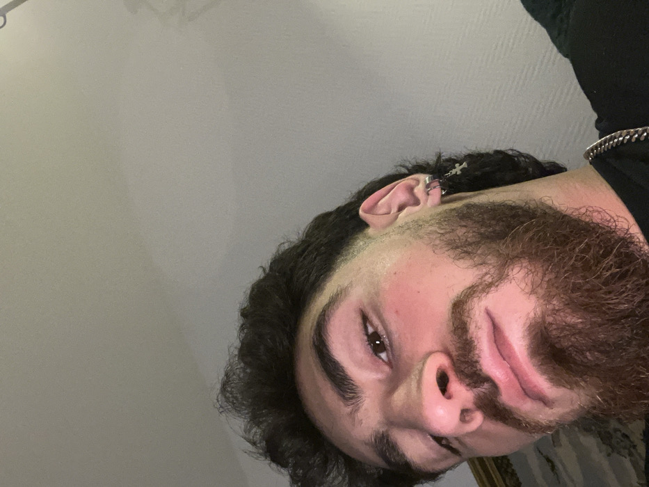 A close-up, angled selfie of a person with dark, curly hair and a full, reddish-brown beard