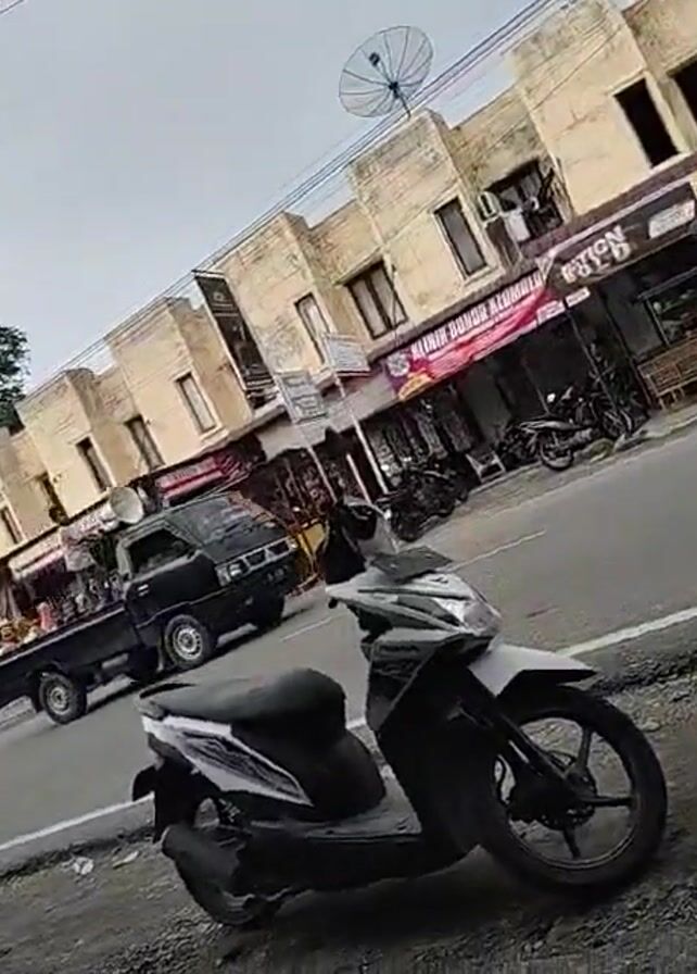 street scene in front of a row of two-story buildings with shops on the ground floor. Parked on the side of the road, in the foreground, is a white and black scooter. Behind it, on the road, a black pickup truck filled with people and loudspeakers attached to the cab is driving past. Other parked motorcycles are also visible, and a single motorcycle is seen driving in the opposite direction in front of the truck. The sky is overcast. Satellite dishes are visible on top of the buildings.