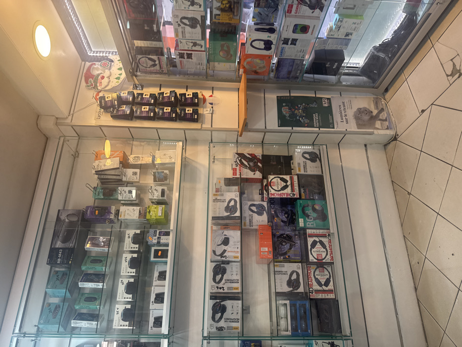 The image displays the interior of a retail electronics store in Strasbourg, France. The scene is static, devoid of people, and features extensive merchandise displayed within glass shelving units against white walls. The flooring consists of light-colored square ceramic tiles, exhibiting minor scuff marks and visible dirt in the grout lines, particularly near the corner. Overhead, a circular recessed ceiling light provides illumination, supplemented by LED strip lighting integrated into the display cases. Along the left wall, a multi-tiered glass display unit holds numerous boxed electronic items. The upper shelves contain small speakers, networking devices, and various accessories, some marked with "25€" price tags. The lower shelves are stocked with boxed headphones and headsets, identifiable by labels such as "4D HEADPHONE," "RGB LIGHT," and "GAMING," with several items priced at "20€." In the corner, a vertical white support column separates the left display from a glass cabinet on the right. This column features two posters: an upper one with abstract colorful graphics and text including "DOMINIQUE TOUTE SEULE" and "TAPS," and a lower poster depicting a white wolf with the title "Lumières sur le vivant." A small, unadorned wooden shelf protrudes from this column at mid-height. Above the right-side glass display cabinet, a large, festive Santa Claus head decoration, bordered by white LED string lights, is affixed to the wall. This cabinet is also filled with boxed headphones, headsets, and other electronic peripherals, some explicitly labeled "GAMING." To the immediate right of the corner column, a vertical white panel displays multiple packages of "Lyco+" branded items, likely mobile phone accessories.