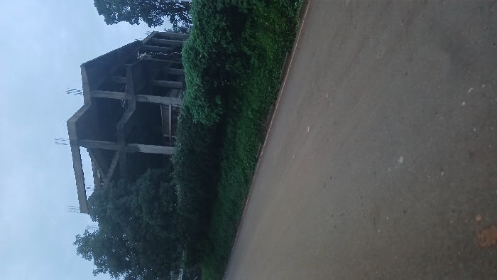 A still image depicts an unfinished multi-story concrete building located in Kisii, Kenya, viewed from across a dirt road. The building's structure consists of exposed concrete columns, beams, and floor slabs, comprising at least four visible levels, with rebar extending vertically from the uppermost floor. A dense, verdant line of shrubs and trees forms an embankment situated between the road and the construction site, partially obscuring the building's left side. The foreground features a light brown dirt road, bordered by a narrow strip of green grass on its right edge. The sky above is uniformly overcast and grey. No individuals, vehicles, or discernible activities are present in the scene.