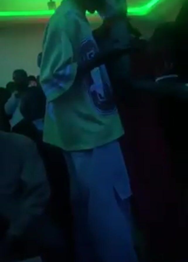 dimly lit indoor event or party with several people present. In the foreground, a person wearing a light green jersey and light gray cargo pants is dancing with another individual in a red dress. They are close, with arms around each other. There are other people visible in the background, some standing and some seated, though they are mostly out of focus. The lighting changes from red to green to blue, creating a typical club or party atmosphere.