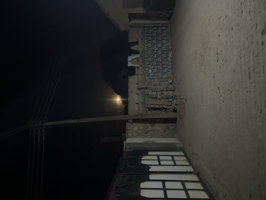 A nighttime scene shows an outdoor view of a partially-lit area. A structure with a brick-like facade is visible, featuring multiple square windows. In the distance, an electrical pole stands, supporting power lines. A street or walkway stretches along the side, with a textured, concrete-like surface. The dark sky and limited illumination suggest a rural or suburban setting.