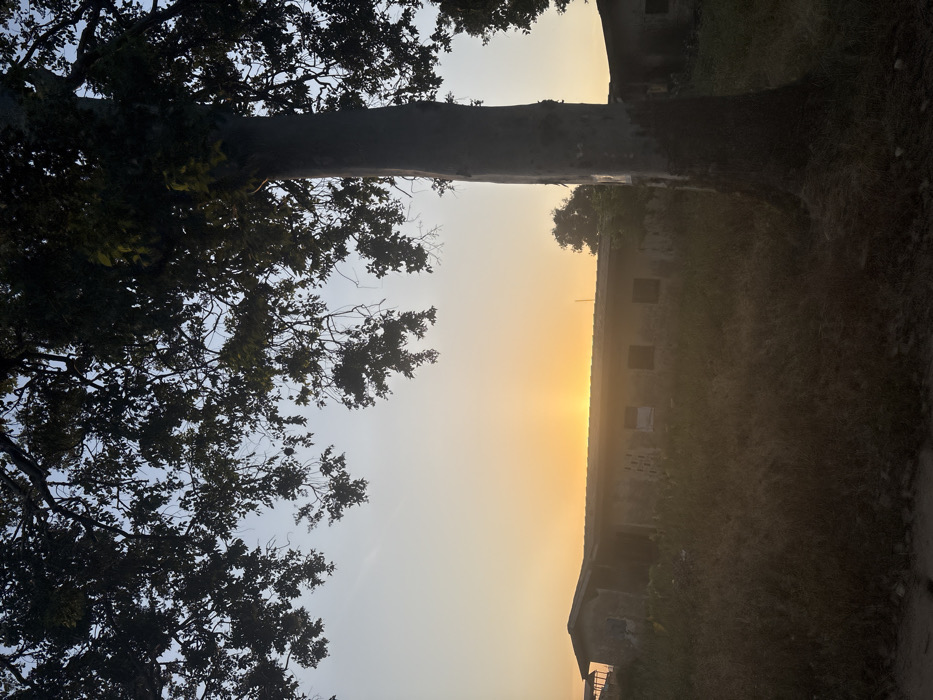An outdoor scene in Rafin Par, Nigeria, depicts an evening or morning twilight. The sun, a bright orange orb, is positioned low on the horizon, casting a warm glow across the sky and illuminating the upper portion of a dilapidated, single-story building in the midground. The sky transitions from bright orange at the horizon to pale blue overhead. In the foreground, a large tree trunk dominates the right side of the frame, extending vertically out of view. Its canopy, dense with dark green foliage, covers the upper third of the image, silhouetted against the sky. The ground beneath the tree and in front of the building is covered with dry, overgrown vegetation. The central subject is a long, low-slung building constructed of concrete or cinder blocks, featuring a dark gabled roof. Multiple dark, rectangular window openings are visible along its facade. The building exhibits signs of disrepair, including weathered surfaces and incomplete window coverings. To the far left, partially obscured, is the roofline of another structure. No individuals are visible.