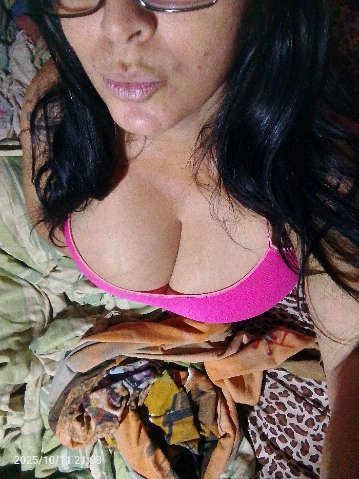 A close-up, high-angle indoor photograph depicts a female individual from the chest up, positioned against a background of textiles. The location is an unspecified private residence in Unknown, Unknown. The individual has dark, wavy hair falling over her shoulders and wears eyeglasses with metallic frames. Her lips are pursed. She wears a bright pink tank top or bralette, revealing a deep cleavage. The immediate background consists of crumpled fabrics: a light green and beige striped textile on the left, and a collection of various other crumpled fabrics below her chest, including one with a brown leopard print pattern and others with abstract designs in orange and brown tones. A timestamp "2025/10/11 21:08" is visible in the lower-left corner of the image.