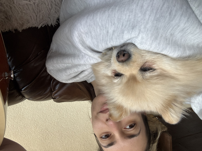 An indoor scene in a residence in Razlog, Bulgaria, features an adult female holding a small, light-colored Pomeranian dog. The female, visible from the chest up with her right eye and nose prominent, has dark hair and wears a light grey hooded sweatshirt. She is seated against a dark brown leather sofa with visible tufting. Her left arm, covered by the sweatshirt, cradles the dog, which is resting its head on her arm with its eyes partially closed, appearing to be asleep or deeply relaxed. In the background, a light beige textured wall is visible above the sofa. To the far right, a portion of a brown, glossy musical instrument, likely an acoustic guitar, is visible, showing a chrome strap button. A fluffy, light-colored blanket or rug is partially visible in the bottom right foreground.