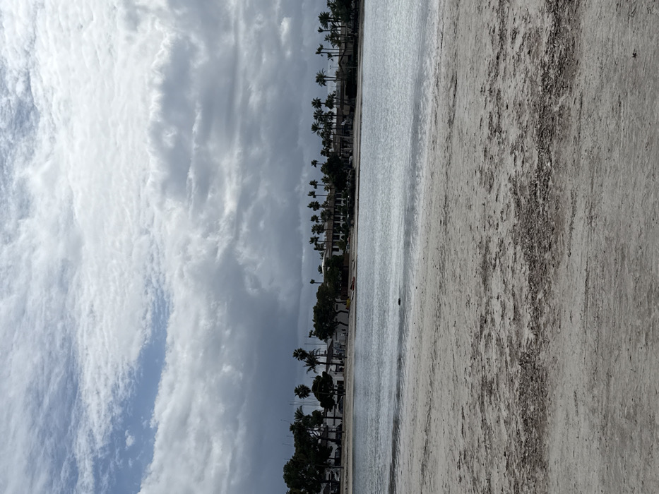 This image depicts a coastal scene in Alcúdia, Spain, under a heavily overcast sky. The foreground consists of a light-colored sandy beach, approximately one-third of the frame, showing irregular patches of dark, matted organic debris. The midground features a calm body of water, likely a bay or a protected sea inlet, reflecting the grey sky with subtle ripples on its surface. A small, dark, indistinct object is partially submerged in the water, slightly left of center. The background reveals a developed shoreline with a dense line of various trees, predominantly palm trees. Behind these trees, multiple low-rise buildings, mainly white or light-colored, are visible. On the left, masts of docked sailboats indicate a marina, with vehicles parked nearby. In the center-right background, two small red or orange watercraft, consistent with kayaks or small boats, are beached near the waterline. The sky, occupying the upper portion, is largely covered by thick, grey, and white clouds, with a small patch of lighter blue visible in the upper-left quadrant. No individuals or active interactions are present in the scene.