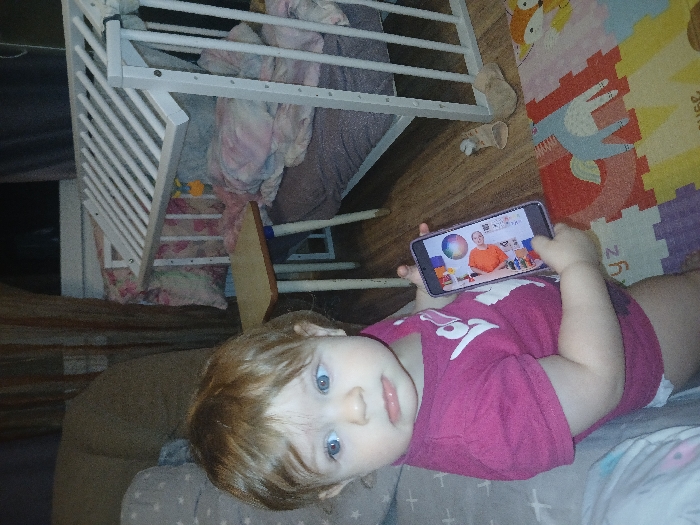 A baby with blue eyes and auburn hair lies on a pillow, wearing a pink shirt. The child is holding a smartphone displaying a cartoon. A crib stands nearby. A colorful foam mat is visible on the floor. The background also includes a brown, textured sofa. The perspective suggests the photo was taken from an elevated angle.