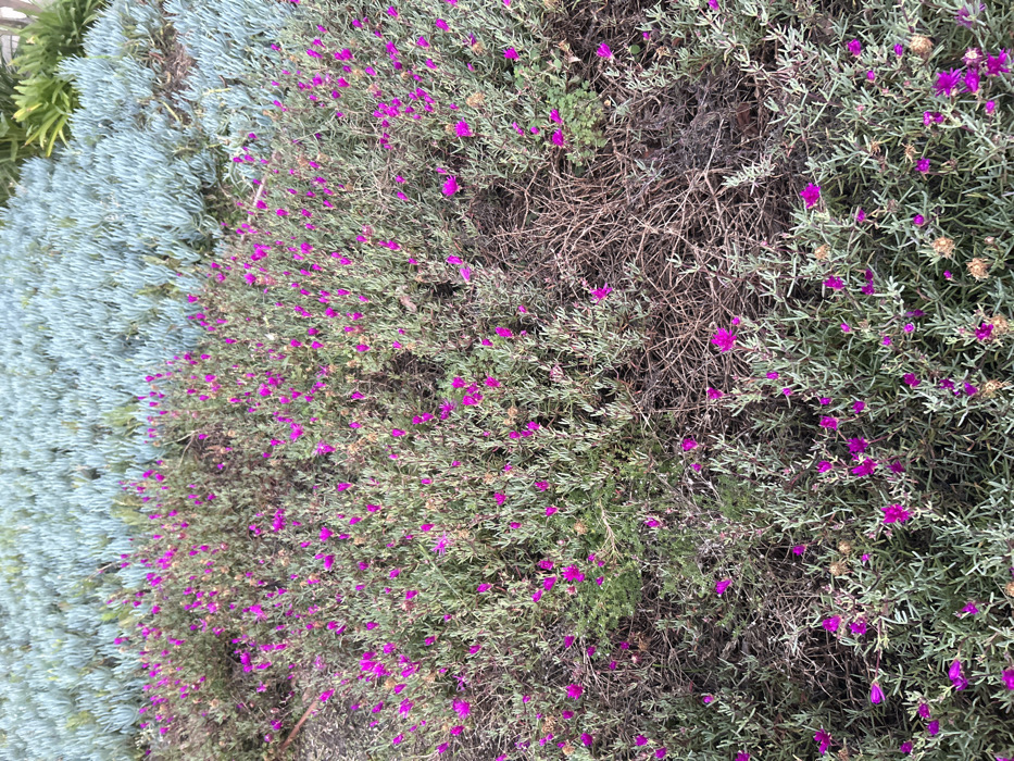 A dense ground cover of green foliage speckled with vibrant magenta flowers dominates the frame. Patches of bare, brown twigs weave amidst the greenery. To the left, a section of silvery-blue foliage provides a contrasting texture and color. The overall impression is a thriving, slightly overgrown garden bed. The image is taken from a close, slightly elevated perspective.
