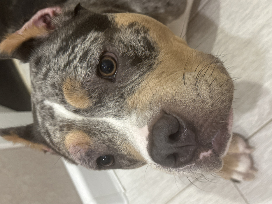 A dog's face dominates the image, angled closely to the camera. The dog's coat exhibits a mix of mottled grey and tan coloring. Its eyes are glossy and brown, reflecting light. A large, wet, black nose is prominent, with visible whiskers. The background is out of focus, appearing as a light-colored, slightly textured surface. One ear is partially visible, folded over. The overall impression is intimate and focuses on the dog's unique markings and expression.