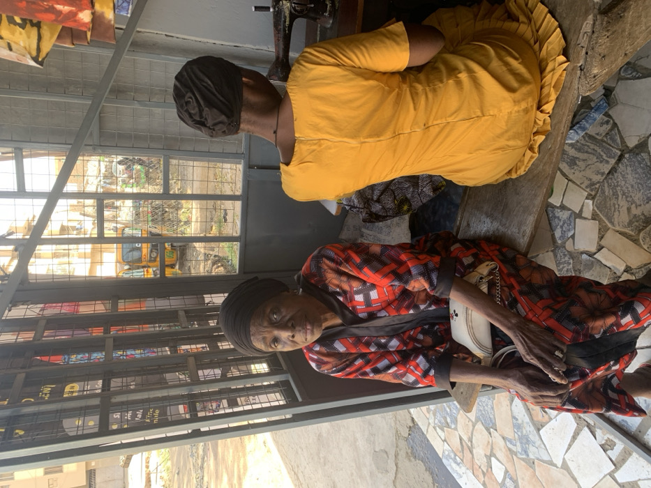 The image depicts an indoor/outdoor commercial space in Sabon Gari East, Nigeria, possibly a tailoring stall or workshop, with a street visible beyond a barred opening