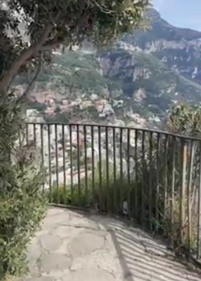 scenic overlook of a town by the coast with mountains in the background. The perspective is from behind a black metal fence with vegetation on either side of it. The ground is paved with irregular stones. The town is densely built with white and red buildings, nestled on the hillside. The blue sea is visible along the coast. The sky is partially cloudy. The camera pans up slightly to reveal more of the town and the surrounding landscape.