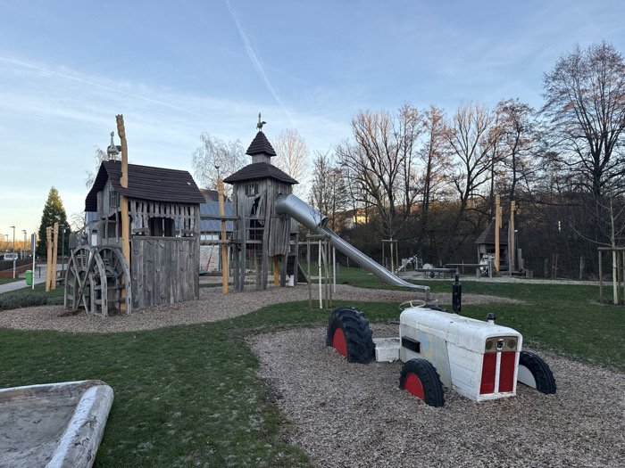 The image depicts an empty outdoor playground in Olingen, Luxembourg, under a clear, light blue sky with a visible contrail. The scene is illuminated by soft, natural light, indicating either early morning or late afternoon. In the foreground, a white and red tractor-shaped play structure is embedded in an area covered with wood chips. It features four black tires with red hubs, a steering wheel, and a black exhaust pipe. To the left, a portion of a shallow, light-colored wooden sandpit is visible on a patch of green grass. The central feature is a large, multi-level wooden play structure resembling a rustic building complex, possibly a mill, with a prominent water wheel design on its left side. This structure is constructed from weathered dark wood, featuring a dark brown roof and lighter wooden supports. It includes a tower-like section with a small weather vane on top, from which a long, silver metal slide descends onto the wood-chip-covered ground. Several other smaller wooden structures and climbing elements are integrated into the complex. Beyond the main play structure, a row of bare deciduous trees lines the background, with a few evergreen trees visible to the far left. Further in the distance, hints of buildings and a road with streetlights are discernible on the left horizon. The ground consists of alternating patches of wood chips and green grass. No individuals are present in the frame, and no actions or interactions are depicted.