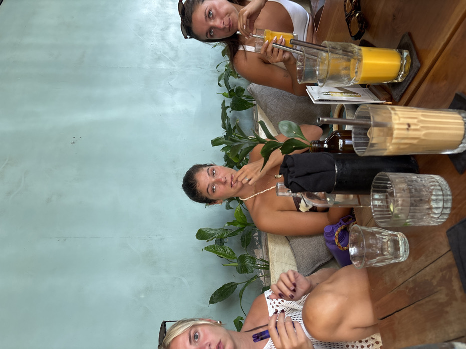 Three women sit at a wooden table with drinks. Two of the beverages are iced coffees or lattes in tall glasses with metal straws, and one is a vibrant orange juice. Green plants decorate the space behind the women, contrasting with the light blue wall. Two women are smiling at the camera, while one seems to be speaking or gesturing.
