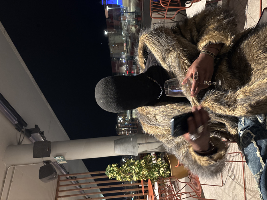 At night on a balcony, a person in a fur coat and black face covering holds a cell phone in one hand and a half-empty wine glass in the other. Their fingers are adorned with rings. A silver chain is around their neck. In the background, city lights glow behind a green potted plant. Speakers are mounted on a white pillar. Red metal chairs stand on the balcony.